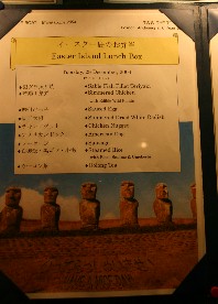 本日の献立。イースター島らしくモアイ像が印刷された献立表だった。(写真左)