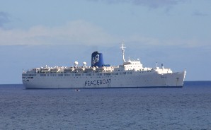 沖合に碇を降ろしたピースボートの「トパーズ号」(写真右)