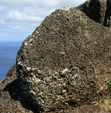 花崗岩のような緻密な石で作られたものではなく固い軽石のようなざらざらした石だ。モアイは