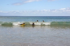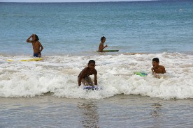 乗り移ってみると意外に高い波だった。海岸近くなると波はもっと高くなり、島の若者達が波乗