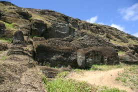 にある岩盤をくり抜いて作られていた。中腹から山裾にかけて完成品と思われるモアイが半ば