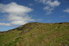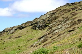 この山は火山(内側には火口湖がある)であり凝灰岩で出来ているようだ。従って、モアイは