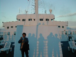 横から射し込む朝日の中で、デッキに立っている人達のシルエットが出来ていた(写真左)