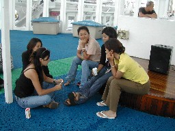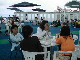船首デッキでくつろぐ人達(写真上)