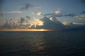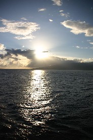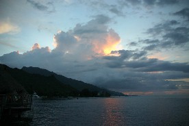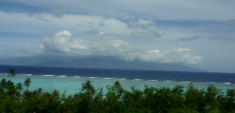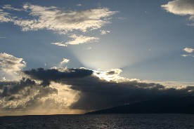 太陽は雲の中にあったが雲間から幾筋かの光りが放射状に洩れていた。また、タヒチの山が