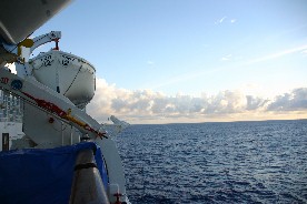 船首の上甲板に出てみると夜明け前の海の彼方にタヒチらしい島影が見えた。いよいよ着いたぞ。