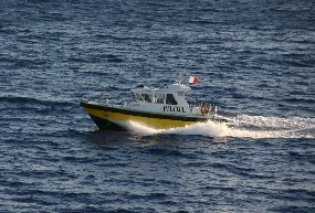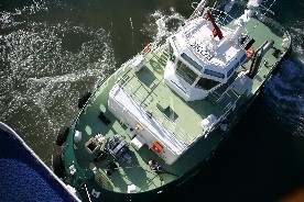 船腹にパイロットと書かれたボートが近づいてきた。どうやら水先案内のボートのようだ。(写真上)