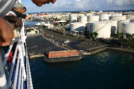 デッキから身を乗り出すようにして着岸する埠頭を見下ろしていた。(写真右)