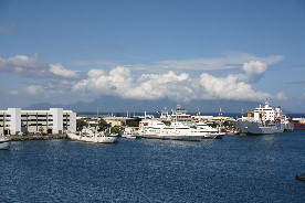 ホテルを離れ港が近くなるとタヒチ本島が沖合に見えていた。(写真左)