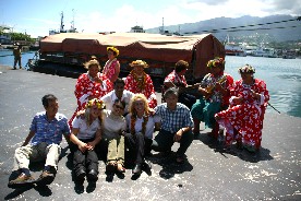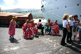 船の下では赤い衣装の女性達が歓迎の歌を歌っていた。(写真右)