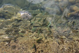 海辺に行ってみると小さな魚が群れていた。それらに混じって色鮮やかな魚や黒い大きな魚