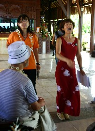 トパーズダイニングにいる人気ウエイトレスやウエイターが早速踊っていた。その中に入って家内も。(写真左右)