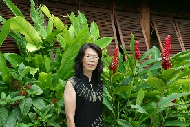 今日迎えるお客さんのために摘んでいるのだろうか。ハイビスカスの花を摘んでいる女性。(写真右)