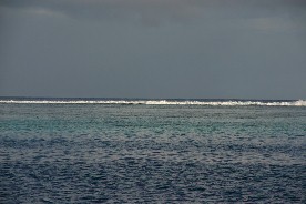 お昼近くになると浅くなっている沖合の珊瑚礁はコバルトブルーになっていた。(写真右)