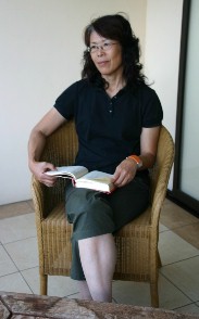 海へ入った後、持ってきた本を読んでいる家内。くつろぎの午後の一時。(写真左)