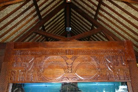 あった。また、フロントの後ろには大きな彫刻と、その下には水槽があり熱帯魚がたくさん泳い