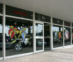 交通量の多い大きな通り、その通りには日産自動車の店も。(写真左右)