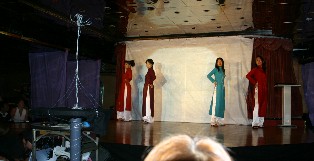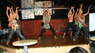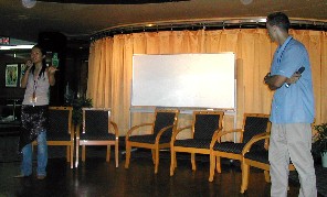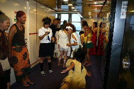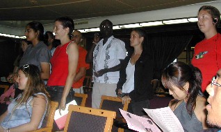 水先案内人(講師、演奏家)の紹介があり、引き続いて挨拶があり、担当のピースボートスタッフとCC(通訳)の紹介があった。
