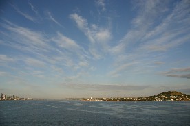 早朝のオークランド港上空は晴れ渡っていた。そして、幾本もの筋状の雲が空を覆っていた。