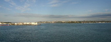 上甲板から眺めたオークランド港は美しい港だった。進行方向右手には大きな橋があり、正