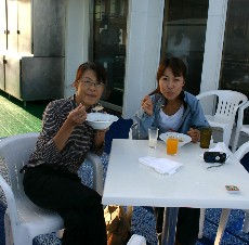 着岸風景を見ながらの朝食、みんな楽しそうだね。(写真左、右)