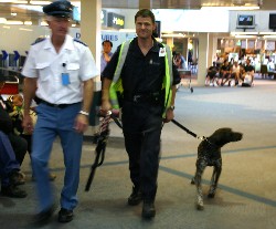 テロを警戒しているのだろうか、それとも麻薬の取締だろうか、犬を連れたガードマンか警察官がパトロールしていた。(写真左)