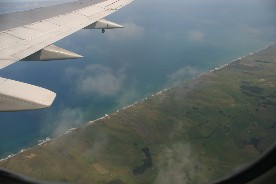 眼下には海が(写真左)、そして飛び立った北島の海岸線が見えた(写真右)