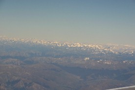 やがて見え始めた陸地(写真左)、そして山脈には白い雪が見えていた(写真右)