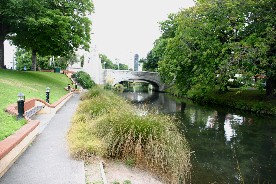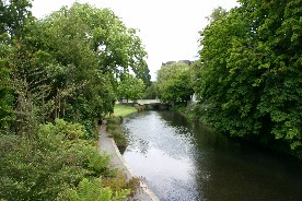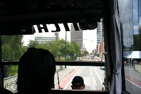 観光バスで市内へと入る(写真左)、レストランはこんなきれいな川の畔にあった。(写真右)