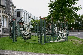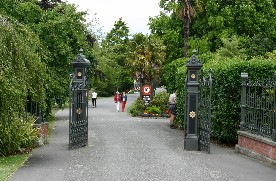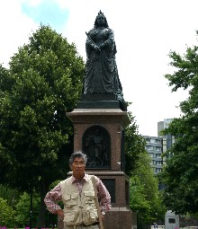 公園の横を走っている市内電車(写真左)、公園の中に立っていたイギリスのマーガレット女王の銅像(写真右)