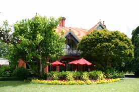お嬢さんのために建てたという赤い屋根瓦の建物、今は喫茶店になっているようだ。(写真左)