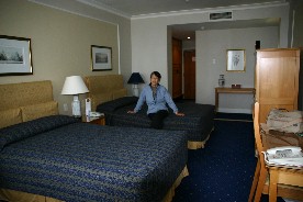広い室内と大きなベッド、この日は船内の狭いベッドではなく大きなベッドでゆっくりと寝ることが出来た(写真右)