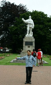 ビジターセンター前は公園になっていた(写真左)、その一角にヒラリー卿の若き日の銅像が立っている(写真右)