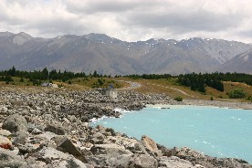 デカポ湖の水は白く濁ったブルーだ。この色は水に溶け込んだ岩石の微粒子が光りを反射して見える色のようだ(写真右)