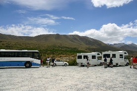 プカキ湖の駐車場にはマイカーの他にもこんなキャンピングカーが何台も停まっていた(写真右)