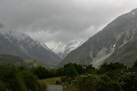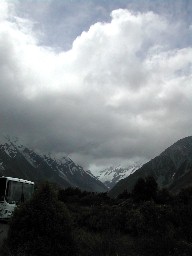マウントクックの厚い雲はいつまでたっても消えそうになかった(写真左)