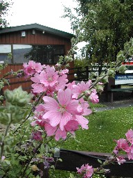 土産物店の店先(写真左)、その横に咲いていた日本でも見かけることの多い立ち葵の花(写真右)