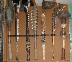 店内に飾ってあった原住民マオイの祖先が用いたと思われる武器(写真左)