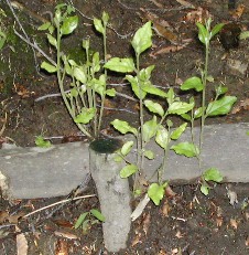未調査の木 山道の階段に使っている木から芽が出ていた 美しいスギゴケ