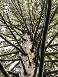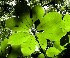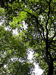 日差しの差し込む遊歩道 見上げれば大木の間から青空 見事な自然の造形美