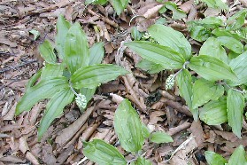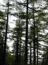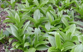 バイケイソウの群落 芽吹き始めたばかりのカラマツ林