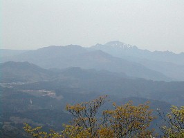 千軒平の山頂にて(遠く大山など雄大な景色を眺めながら弁当を食べた) 私達は、ここで少し遅い昼食をとり下山した。下りに選んだ山道は、とても急な坂道だった。従って、登り道