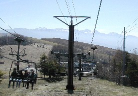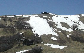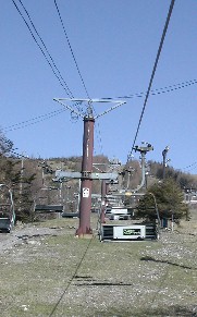 こんな三人がけの幅広いリフトで頂上を目指します。山頂付近には雪が残っていました。 ![]()