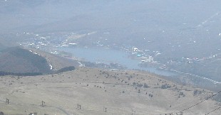 さすがはスキーのメッカです。なだらかな山の斜面にはたくさんの雪が残っていました。 眼下には霞がかった白樺湖が見えます。 ![]()