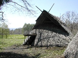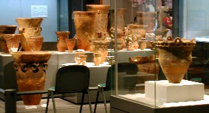 考古館の裏手にはこんな建物が何棟か復元されていました。 館内に入ってみました。親切な受付の人の説明を聞き最初の部屋に入りました。夥しい数の縄文土器が展示されて