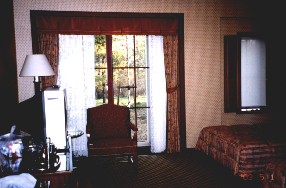 私達が泊まった部屋の一角です。窓からはすぐ外へ出入り出来ます。 部屋のすぐ外にはホテル内の散歩道がありました。部屋の前にも大きな落葉松や樅の木が聳えています。どの部屋も