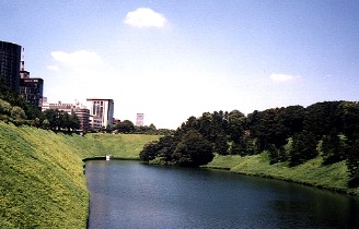 アオコの浮いて緑に染まった皇居のお堀 時折、水面には大きな鯉が顔を出して餌を待っている。堀の周辺部は良く整備された遊歩道に