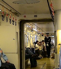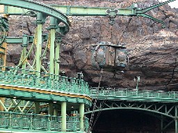 ディズニーリゾートラインというモノレールカーがディズニーシーやディズニーランドを結んで循環している。 左はホームへモノレールカーが入ってきたところ。そして、モノレールカーの車内の吊革はミッキーマウスだった。 ![]()