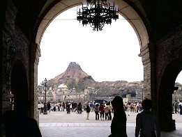 そして大きな池の向こうには巨大な人口の火山が聳えている。その火山の下にあるトンネルをくぐり