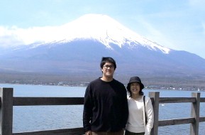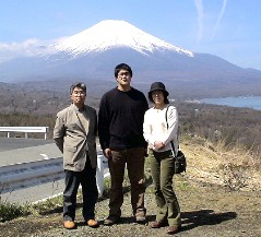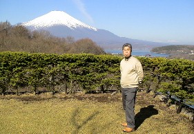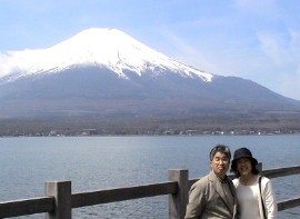 XIV山中湖を出て富士山の眺望が楽しめる場所まで行ってみた。 既に何組もの人達が来ていてカメラを構えていた。私達も富士山を背景にして記念写真をパチリ。 ![]()